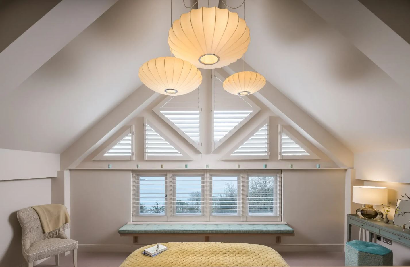 Shaped shutters look fantastic on angled shapes and spaces. These cool shutters will blend seamlessly into angled and slanting windows and doors, without masking the outline of these special features. White window shutters are a popular option for these types of spaces, merging beautifully into the décor to give an understated finish.